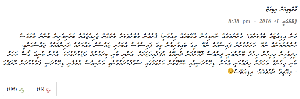 Translation: “She just claimed it was religion of the ideology of Zaeem (Maumoon Abdul Gayyoom) and wore it to get elected to her parliament seat. However (she) only does whatever she does in name only. Previously Zaeem had said he’s a religious person and bragged and boasted about it loudly. Now what.”