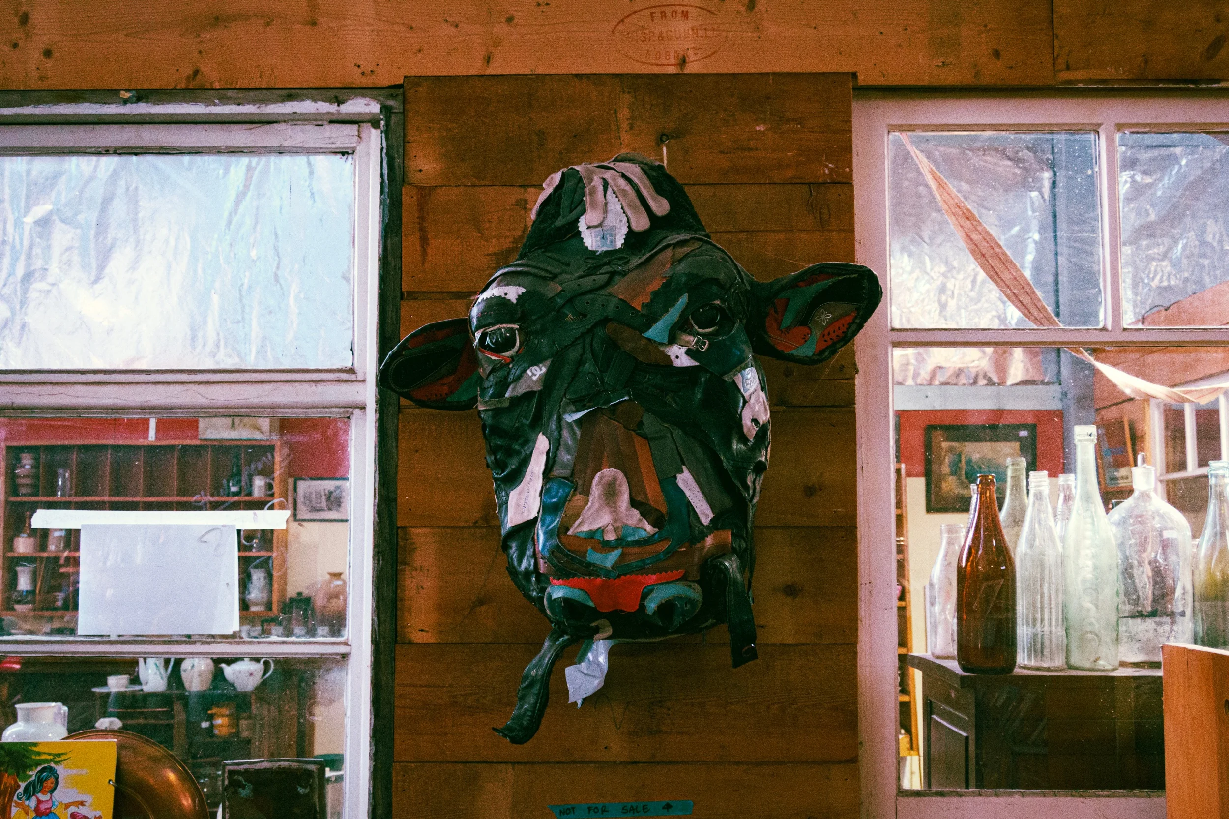 Mounted on the wall of the tip shop is the head of a sad cow made out of recycled leather. Apparently it is not for sale. | G9X II